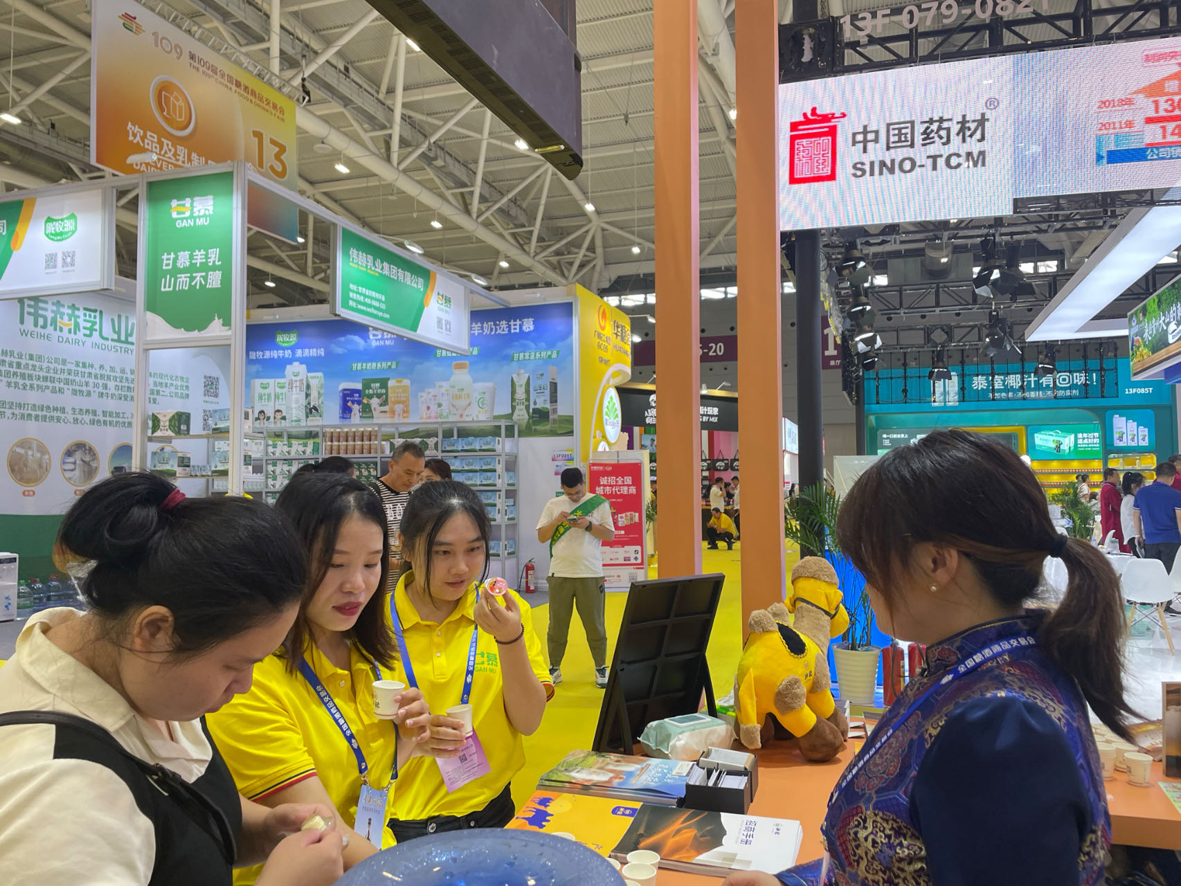 參觀者聚集在展臺(tái)前品嘗來(lái)自阿拉善的駱駝鮮奶