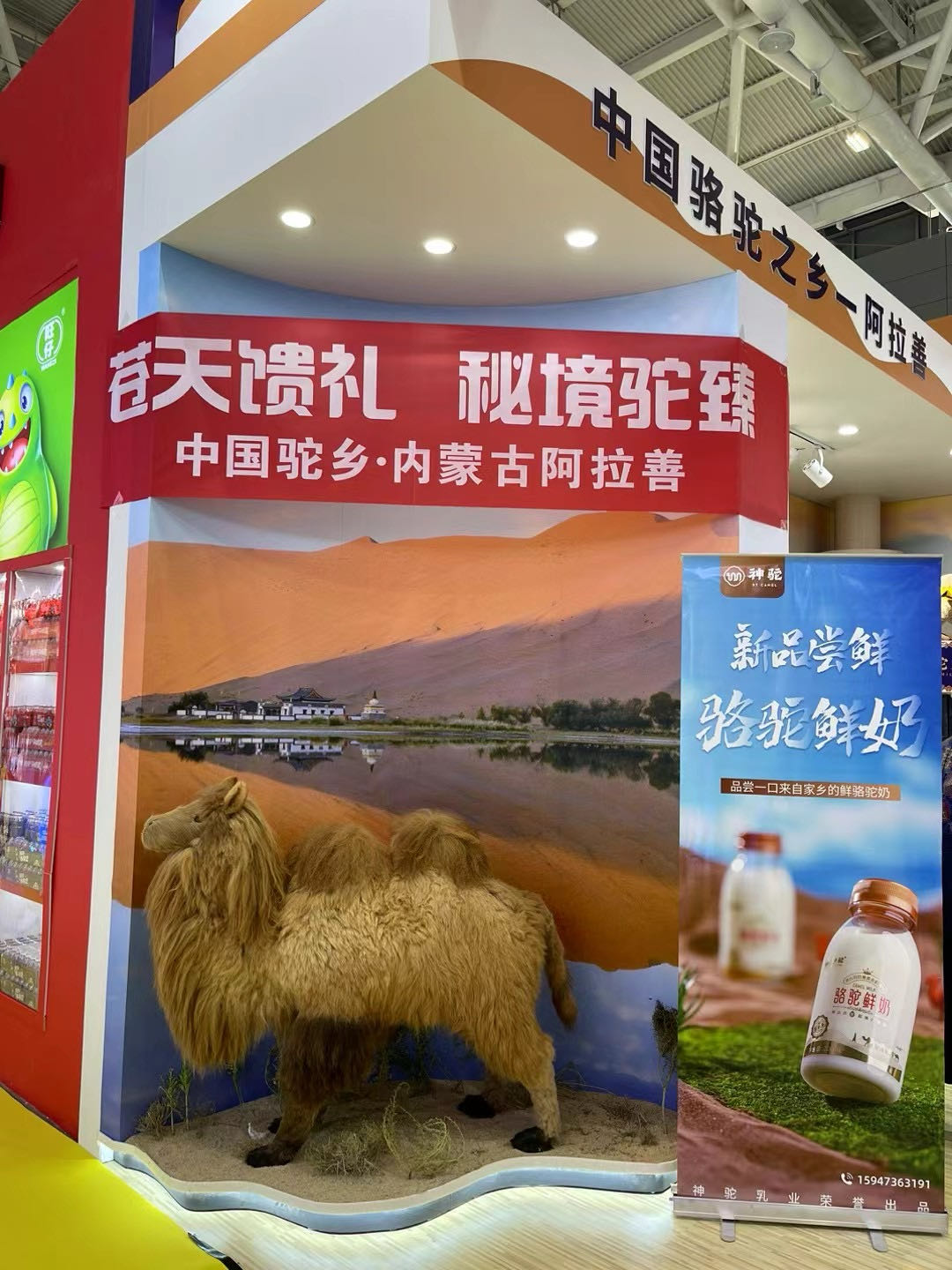 參觀者聚集在展臺(tái)前品嘗來(lái)自阿拉善的駱駝鮮奶