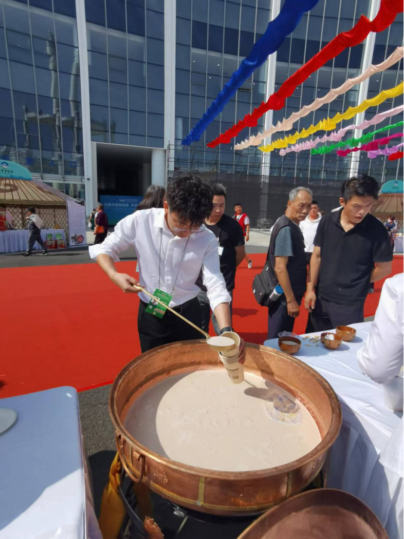 在興安盟展臺現(xiàn)場,一位身著蒙古傳統(tǒng)服飾的阿媽在現(xiàn)場熬制奶茶和制作傳統(tǒng)的酸奶,據(jù)她介紹,這些奶制品都是鮮奶通過慢火慢慢熬制而成的。來品嘗的人都贊不絕口,紛紛豎起大拇指連說,“太純正,太好吃了”。